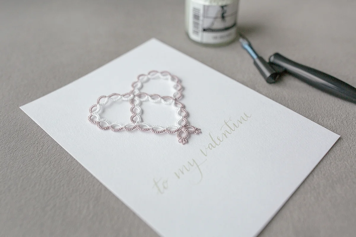 Valentine’s Day is just around the corner, so my daughter and I decided to collaborate on a small project of handmade cards. She recently took a modern calligraphy class at Carpe Diem Collective in West Seattle, and wanted to practice what she learned. And I designed this simple split ring heart pattern using light purple and white thread. These are by no means “perfect”, but we think that handmade, handwritten cards are more thoughtful and meaningful than generic store-bought ones!